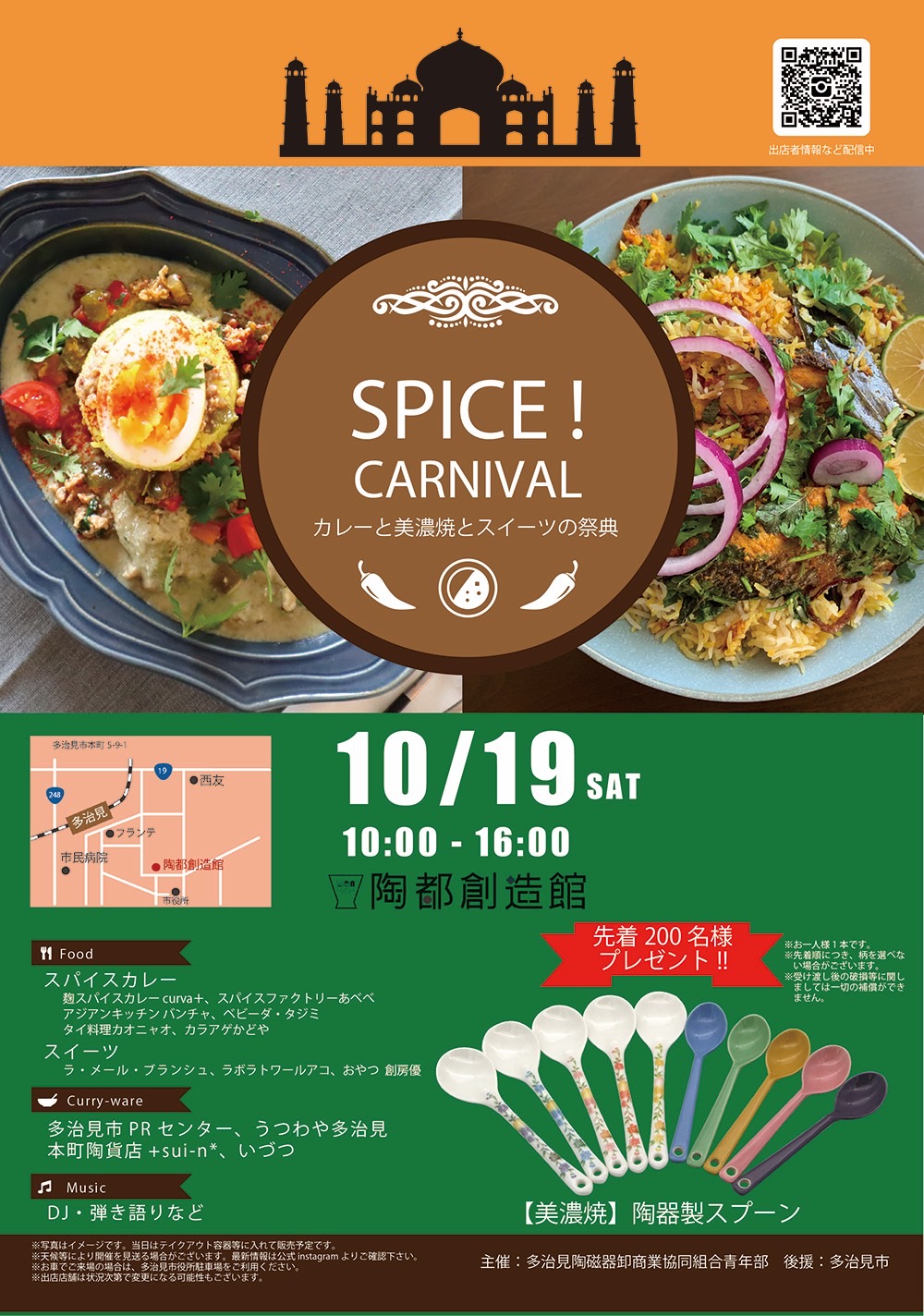 今年も「SPICE!CARNIVAL カレーと美濃焼とスイーツの祭典」が10月19日(土)本町の陶都創造館で開催されます。 多治見市内6つのお店が集まって、自慢の味を競い合います。食後にうれしいスイーツのお店もありますし、弾き語りも楽しめます。 先着200名様にはプレゼントをご用意。もちろんカレーに似合うお皿をはじめ、さまざまな器もいっぱいあります。 皆さまのご来場をスタッフ一同心よりお待ちしています。